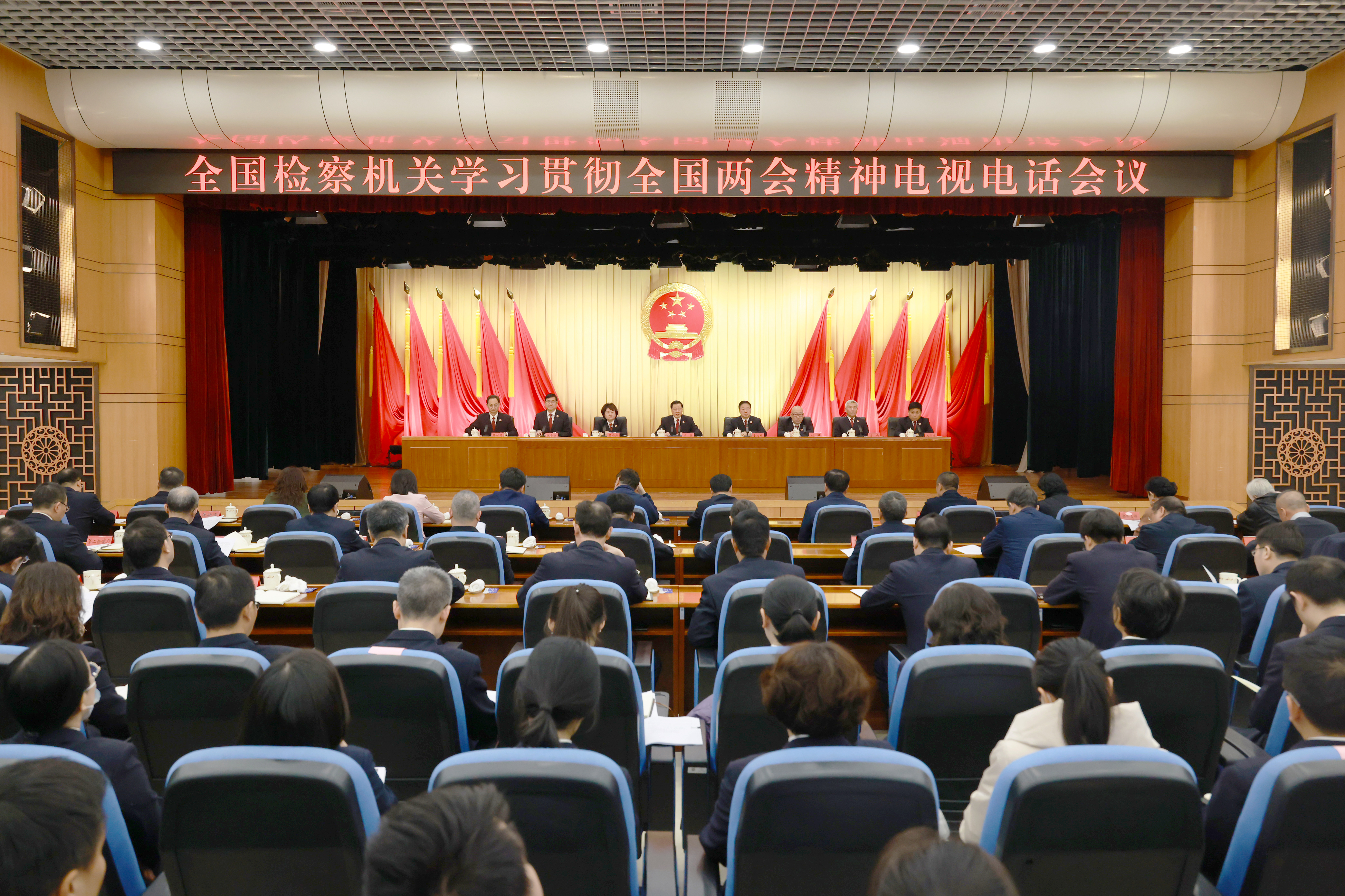 3月14日,最高人民检察院召开电视电话会议,深入学习贯彻习近平总书记在全国两会期间的重要讲话精神和全国两会精神,部署检察机关贯彻落实举措。最高检党组书记、检察长应勇出席会议并讲话,党组副书记、常务副检察长童建明主持会议,党组成员、副检察长葛晓燕传达全国两会精神。会议以视频方式同步开至各省级检察院、解放军军事检察院、新疆生产建设兵团检察院。117位全国人大代表、全国政协委员应邀分别在主会场和分会场出席会议。