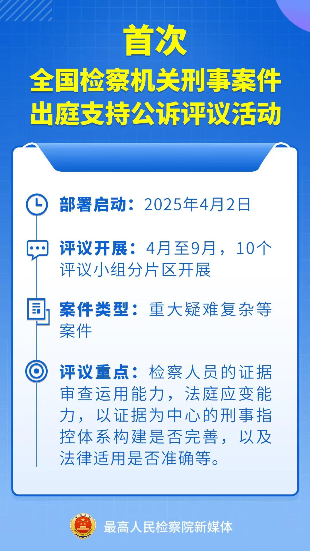 据介绍,此次出庭评议活动由最高检重大犯罪检察厅牵头,普通犯罪检察厅、职务犯罪检察厅、经济犯罪检察厅、未成年人检察厅共同参与,组成最高检出庭评议工作组,负责评议活动的组织协调。全国共分为10个片区,组成10个评议小组,每组负责一个片区。每组4人,由1名特聘资深检察官、2名全国十佳(优秀)公诉人或全国检察业务专家、1名最高检刑检部门业务骨干组成,特聘资深检察官担任评议小组组长。